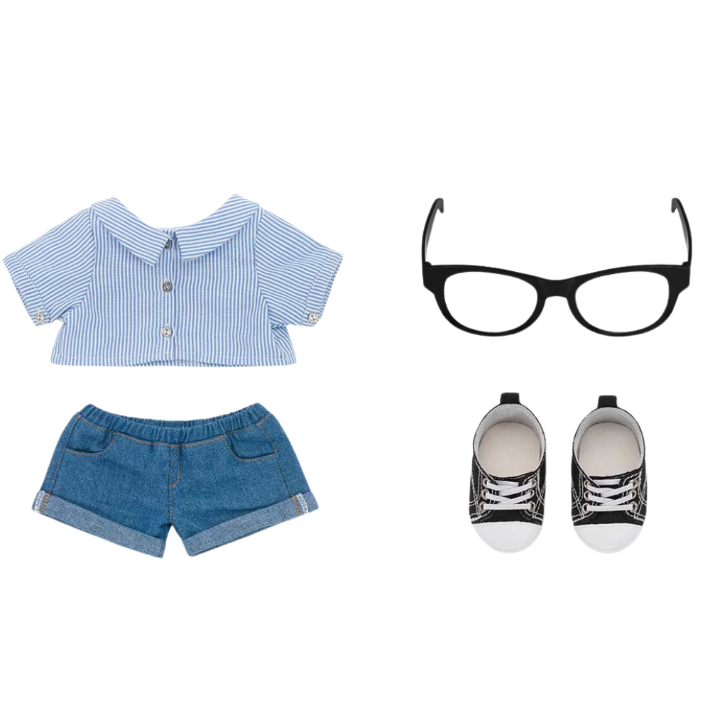 - Tenue textile complète : chemise rayée, jean, baskets + lunettes noires